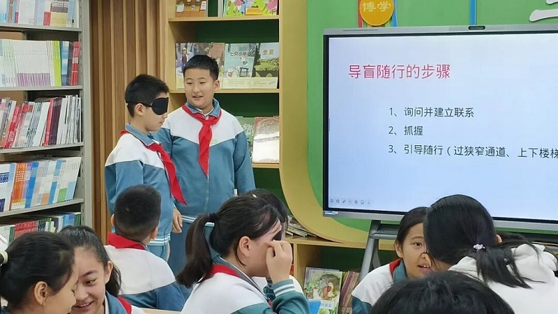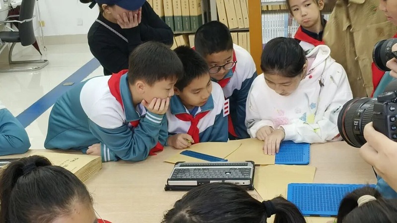 活动伊始,特教老师为小记者们详细讲解了盲文写字板、助视器、盲用电脑等专用学习工具的功能和使用方法。在老师的指导下,小记者们亲手触摸盲文书籍,学习简单的盲文数字拼写,对这种“触摸的知识”有了更直观的认识。最让小记者们印象深刻的是盲行体验环节——戴上眼罩后,他们小心翼翼地搀扶同伴,用双手感知方向,短短几分钟的“黑暗之旅”,让大家深刻体会到视障伙伴日常出行的不易。