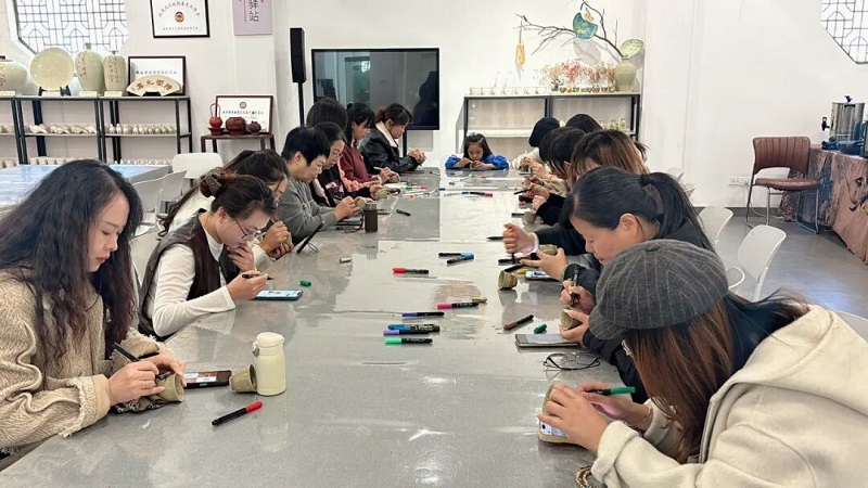 随后,瓯忆工作室的技艺传承人手把手教学。活动现场,大家手握画笔,在瓯瓷上尽情挥洒创意。从构思到落笔,每一笔都凝聚着对传统技艺的敬意与个人巧思,将艺术灵感与瓷器质感巧妙融合。无论是初次接触陶艺的新手,还是对瓯窑文化满怀好奇的爱好者,都在创作中找到了独特的乐趣,让原本朴素的瓷器被赋予了鲜活的文化内涵,也让传统瓷绘技艺的魅力在指尖流转。