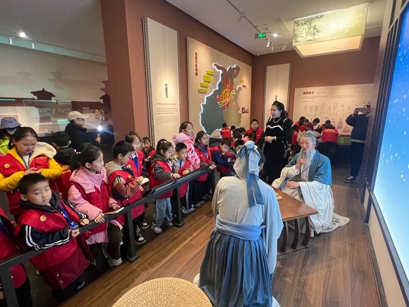 采风之旅第一站,满满的仪式感。在基地的广场上,小记者挺胸抬头站成队列。随着引导员一声“拜师礼始”,大家纷纷双手交叠于胸前,缓缓躬身——这一礼,敬的是悬壶济世的古代先贤,敬的是绵延千年的中医药智慧。行礼时,小记者的眼神格外认真,有的轻轻抿着嘴,有的悄悄调整姿势,生怕辜负了这份庄重。随后,进入扁鹊纪念馆,小记者仿佛“穿越”到两千多年前。这座拥有“全国中医药文化宣传教育基地”等众多称号的场馆,藏着太多关于医祖扁鹊的故事。展馆内,一幅医学发展的历史画卷徐徐展开,从远古时期的医药起源到历代名医的卓越贡献,以丰富的图片资料、人物塑像等形式一一展现。“这些展品让我们看到了中医药发展的完整脉络。”小记者吕怡洁说,“原来每一个时代都有那么多医者在为百姓健康默默奉献。”