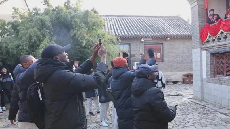 在牟氏庄园的古朴院落中,外国友人穿梭于青砖灰瓦间,感受民居建筑的恢弘格局。一场生动的“牟家喜事”实景演绎,让嘉宾们置身胶东传统婚俗的热闹场景。大家接过寓意吉祥的喜糖,参与民俗互动,欢声笑语回荡在百年庭院。