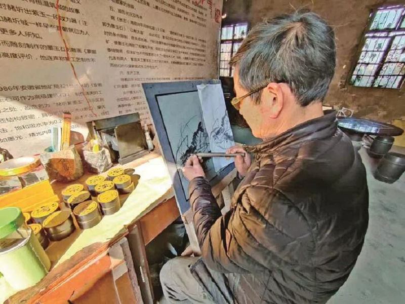 赭圻紫墨玉工艺品的诞生,始于“百中选一”的严苛选料。因墨玉石不同于其他矿种,开采必须采用露天作业方式,通过钢索锯石机和凿岩机配合或用近人爆破法,以保证矿石荒料的块度完整,而且不能有岩隙和石经纹,选料难度可见一斑。选料之后是复杂的工艺流程,经过三至五次不等的机械切割、定形,再经五到七次打磨、抛光,最后经手工刻绘完成。每一道工序都必须精雕细刻,不允许出现任何瑕疵,否则即为废品。这份对极致的追求,让工艺价值愈发凸显,2009年11月,墨玉石工艺品入选芜湖市非物质文化遗产名录。