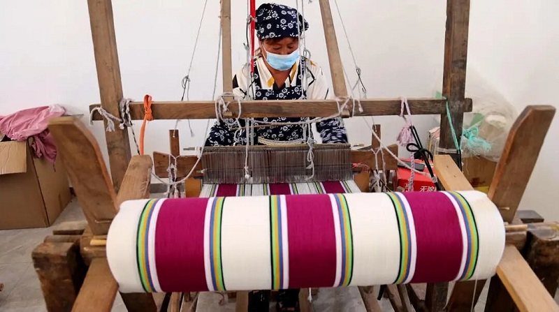 “这些织布机都是老辈子传下来的,最新的也有近百年历史了。”王秀英介绍,织布机由村集体从民间收购而来,一部分放在工坊,一部分放在农户家中,平均每台织布机配三个人,谁有空谁来织,尽量不让机器闲着。妇女们只要付出手艺和时间,就能从这一梭一线中织出生活的甜。工坊的分配原则很简单,每织两块床单,织女可以带走一块,或者每块床单按照市价折算一半的钱作为工资。花纹简单的床单,熟练的织女六七个小时就可以织出一块。每年两万余套床单,从她们的手中诞生,走进千家万户。