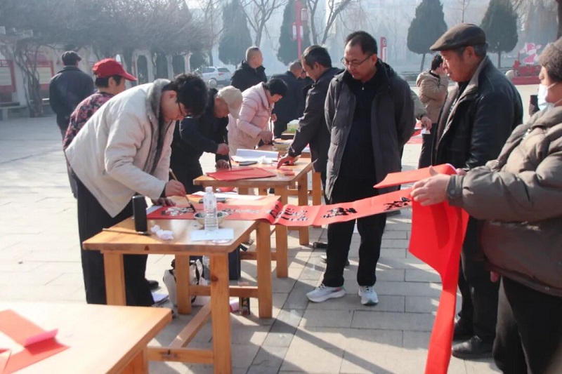 活动开幕式在尧崖头村文化广场举行,广场上,墨香四溢,红纸铺展,书法家们挥毫泼墨,一副副寓意吉祥的春联、一个个饱满圆润的“福”字在他们笔下诞生。“江山千古秀,祖国万年春”“一帆风顺年年好,万事如意步步高”……一副副充满美好祝福的春联,寄托着对新年的期盼,一张张形态各异的“福”字,承载着对幸福生活的向往,现场群众有序排队,欣喜地领取这份特殊的“文化年货”,脸上洋溢着喜悦的笑容。