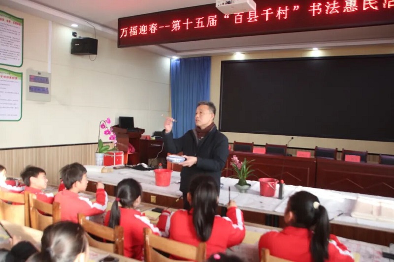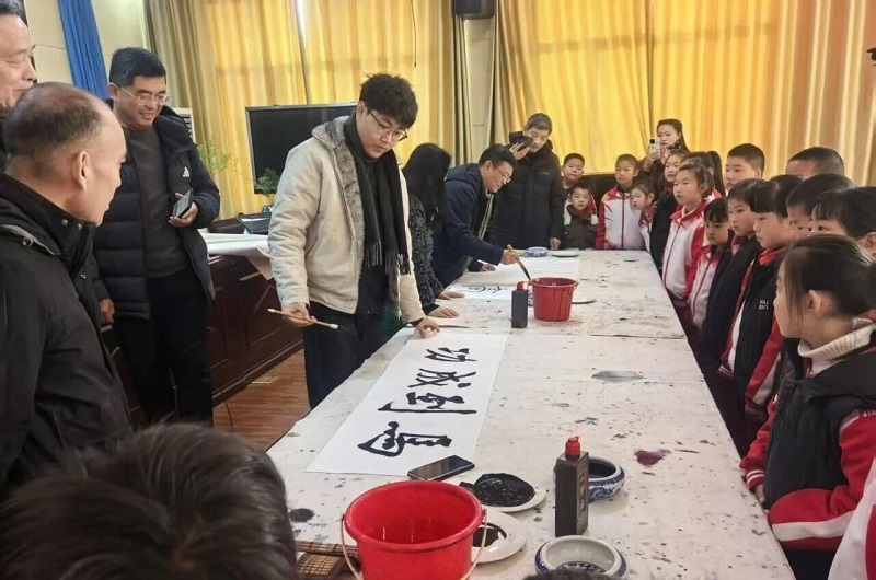 活动首站走进黄山铺镇中心小学,书法家们为中小师生带来一堂生动的书法公益课,书法家们边写边讲,为孩子们演示运笔技巧、讲解章法布局,进行面对面辅导,在书法家的指导下,孩子们体验了毛笔书写的乐趣,接受了一次生动的传统文化教育。