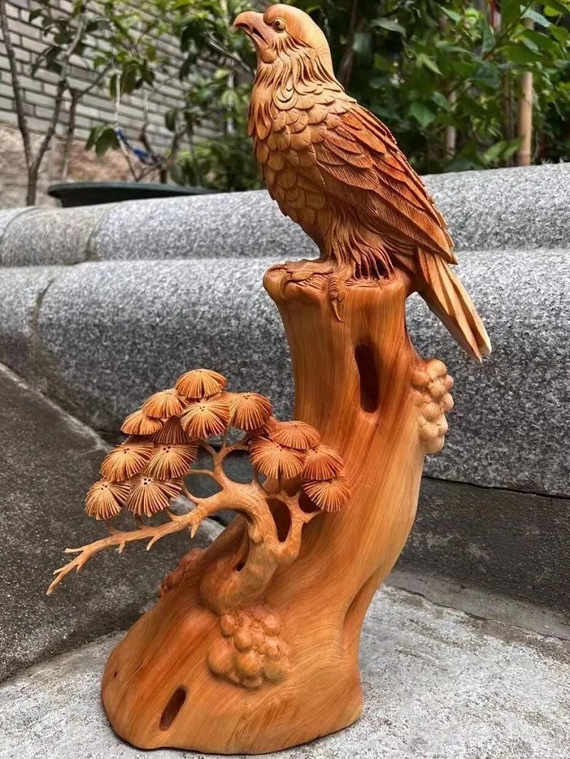 浮雕类的花鸟作品的羽毛近些年运用的新型工艺“丝翎檀雕”工艺,雕刻的羽毛细如发丝,雕出来的花鸟、 栩栩如生。圆雕类主要雕刻立体的动物、人物、佛像等,可以等比例的雕刻出木雕作品,多为以伟人像、佛像、为主。