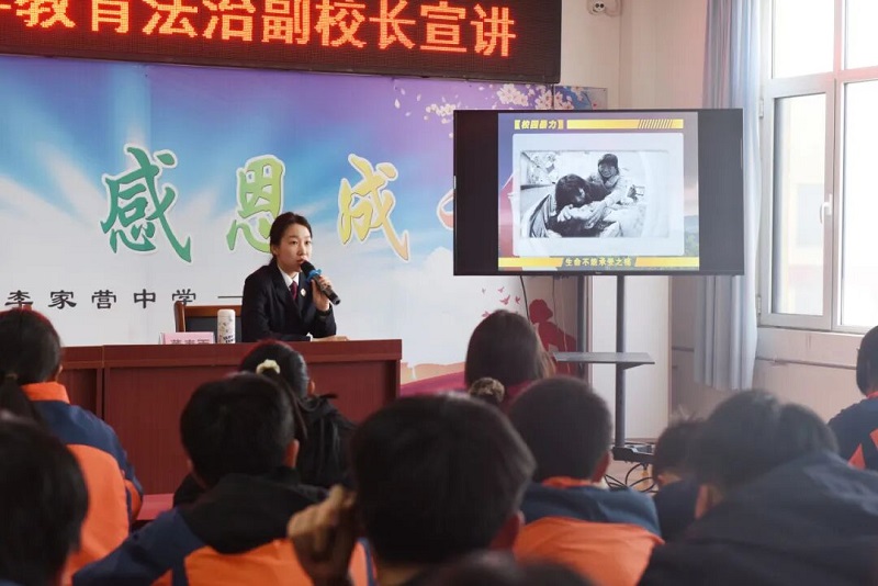 在李家营中学,法治副校长董春雨则围绕校园欺凌主题,为该校200余名中学生送上了一份特殊的“成长守护礼”。她结合中学生认知特点,用情景模拟、互动问答等形式,剖析校园暴力的表现形式、危害后果以及应对方法,当遭受欺凌时勇敢、机智地寻求帮助。报告深入浅出,让抽象的法律条文变得可感可触,在潜移默化中引导同学们知法、懂法、守法,坚决向校园欺凌说“不”!