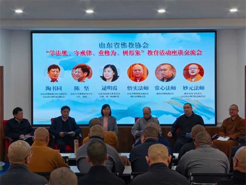 中华文化报官网讯(赵永磊 闫伟杰):近日,山东省佛教协会“学法规、守戒律、重修为、树形象”教育活动座谈交流会在青州广福寺举行。我国佛教协会副会长、省佛教协会会长本悟法师,省佛教协会副会长悟实法师,山东大学佛教研究中心主任陈坚教授,全省16市佛教协会班子成员代表及山东湛山佛学院天台宗专班学僧等参加会议,会议由省佛教协会驻会副会长陶书同主持。