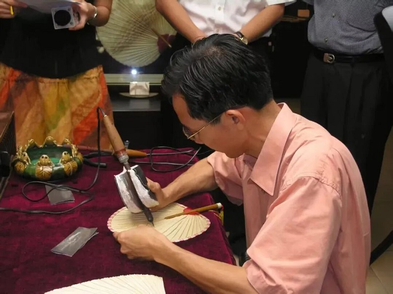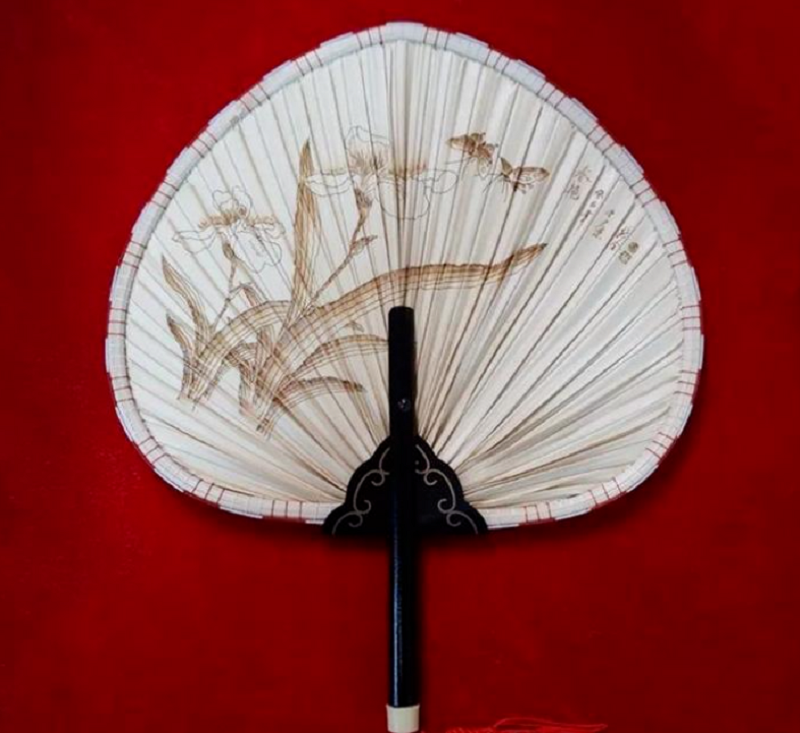其制作工艺堪称“南粤一绝”,关键在于以炭火烧红的铁笔,在薄软的葵扇面上精准烙绘。匠人先以火笔夹固定细铁笔勾勒轮廓、描绘细部线条,再换粗尖铁笔烙出阴影与明暗层次。铁笔不仅温度高,且质地笨重,对匠人技艺要求极高:需运笔娴熟、随时调适温度,既要避免用力过猛或温度过高烙穿扇面,又要防止力度过轻或温度不足导致画面模糊。凭借收放自如的技法,匠人能在米黄色扇面上烙出精致高雅的诗画,成品既具水墨画的艺术韵味,又保留蒲葵叶的天然肌理,色泽素雅、层次丰富且永不褪色,真正实现 “以火不伤扇、画不褪色” 的精妙效果。