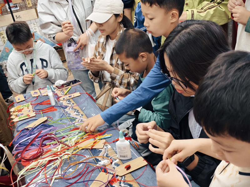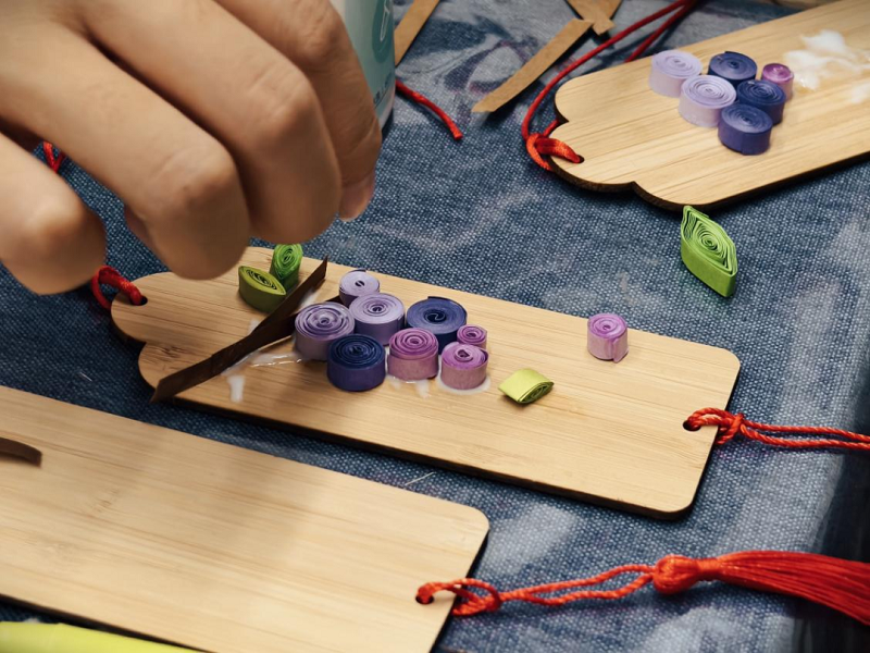 活动伊始,盘纸制作区便排起长队。工作人员示范将彩纸卷成“小糖果”再拼出花瓣,随后,市民游客便热情地开始动手制作,灵巧指尖下,彩纸化作秋菊、葡萄枝等,大家举起成品拍照时,眼角满是笑意。