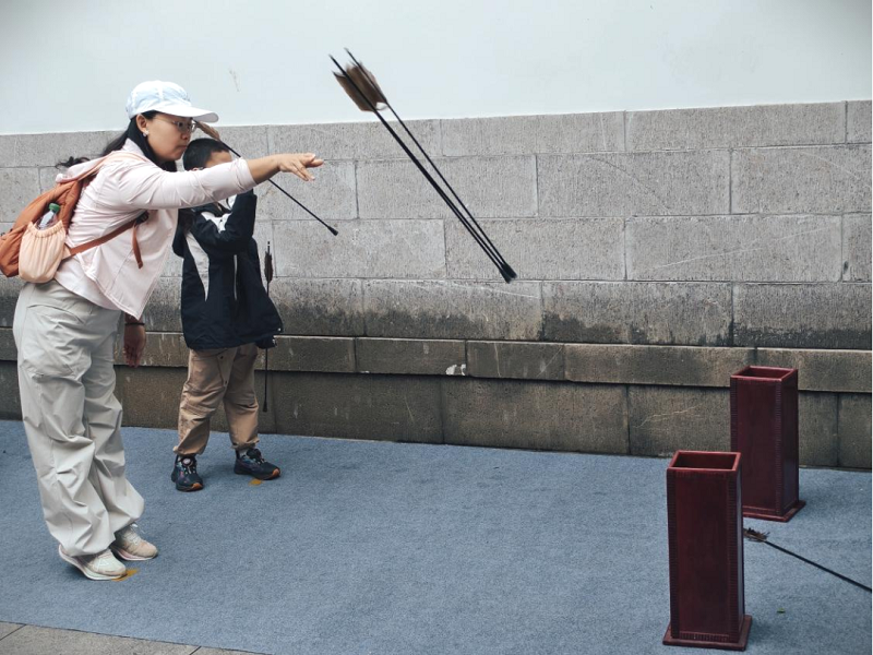 另一侧的投壶体验区同样热闹。仿古铜壶静置中央,“投壶源自射礼,正衣冠、守间距方能彰显礼仪之道。”大家依次排队尝试,在“轮流投、不争抢”的默契中,悄然领会儒家“序”与“和”的内涵。